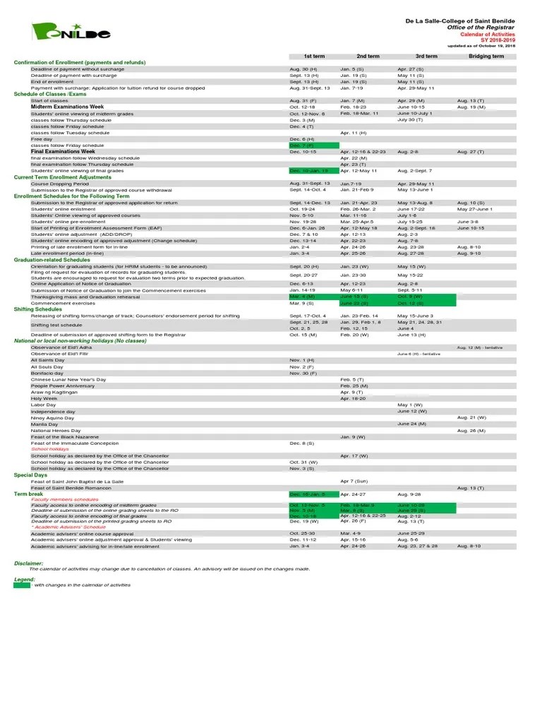 Benilde Calendar of Activities SY 2018 2019 PDF Final Examination