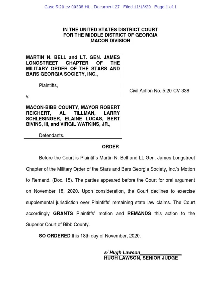 Order Remanding To Superior Court of Bibb County 11.18.20 PDF