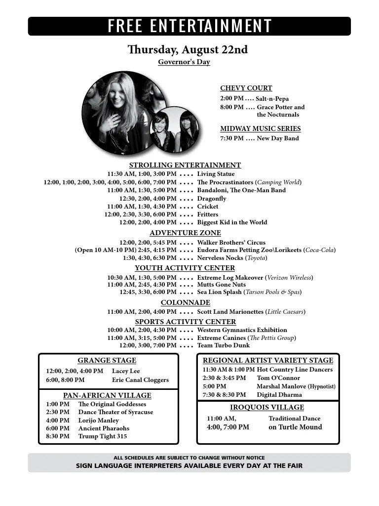 Web during the state fair, the fairgrounds are transformed into the live music entertainment capital of new york state!. The calendar of events for the great ny state fair includes.